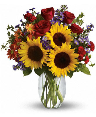The yearning for joy is a basic human instinct that goes beyond personal beliefs and cultural differences. It is a concept that is both universal and abstract, impacting every aspect of our daily existence, from our morning rituals to our long-term goals. Pure Happiness is a beautiful arrangement of flowers that captures this elusive emotion with its vivid hues and otherworldly loveliness. It serves as a reminder that happiness can be found in the simplest of things and that a small act of kindness can brighten someone's day. Made up of sunflowers, roses, daisy sprays, chrysanthemums, asters, and miniature carnations, Pure Happiness is a stunning combination of summer and autumn blooms, representing the timeless nature of joy. Whether given as a gift on Thanksgiving or any other occasion, Pure Happiness is a sincere expression of appreciation and delight, available for immediate delivery through our network of local florists.