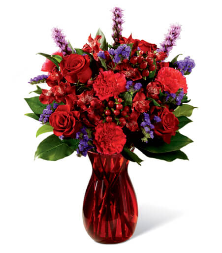 This beautiful arrangement of fresh flowers is the perfect way to say I love you, with its stunning romantic colors and elegant style. It features a combination of rich red roses, red Peruvian lilies, purple statice, hot pink carnations, red hypericum berries, and liatris, surrounded by lush greens for a natural and organic feel. The bouquet comes in a gorgeous red ruby glass vase, adding to its impact.